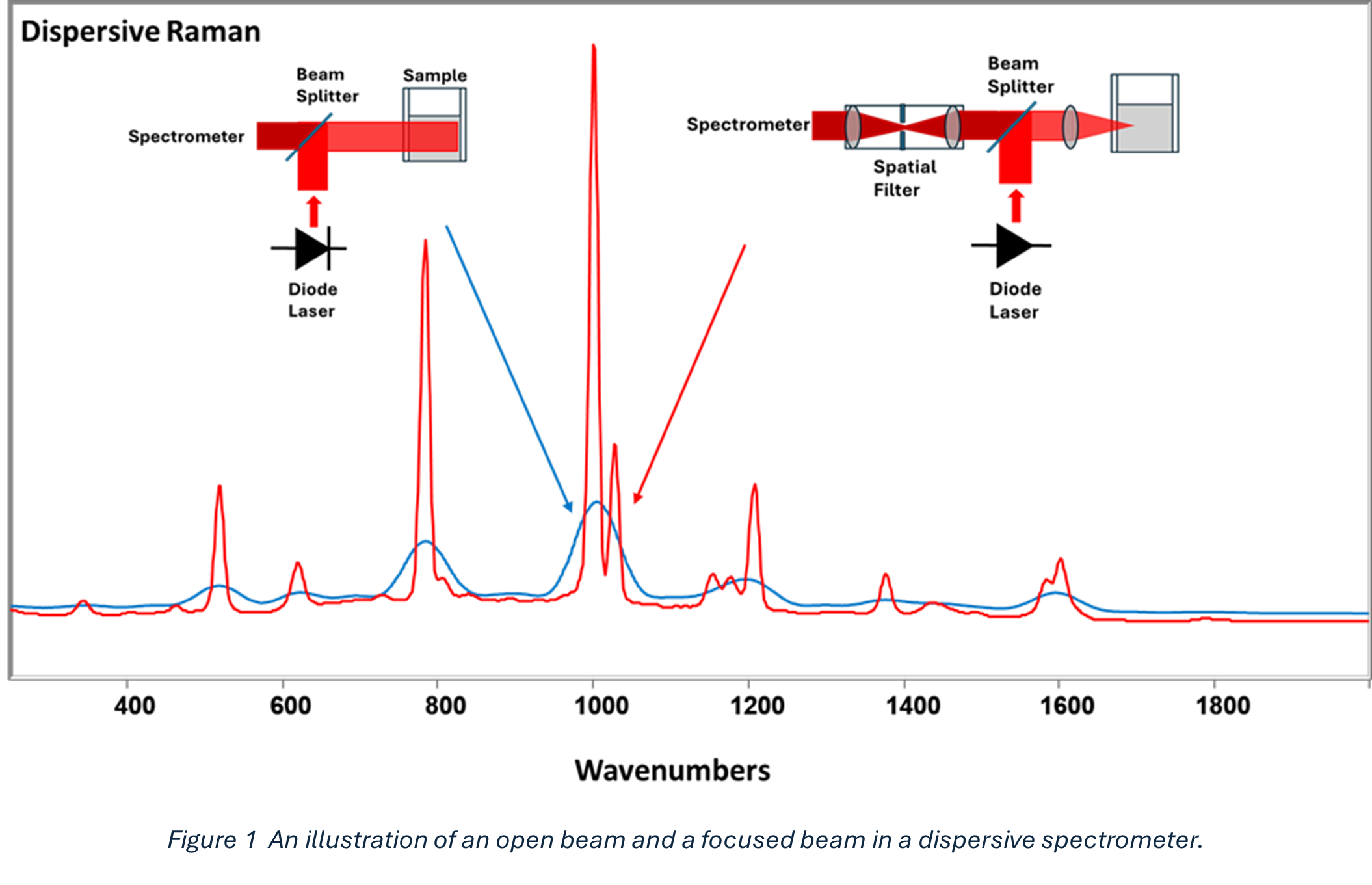 This is the Jacquinot Advantage applied to heterogeneous sampling: large-area illumination produces stable, representative spectra, while tight focusing emphasizes local chemical variation.