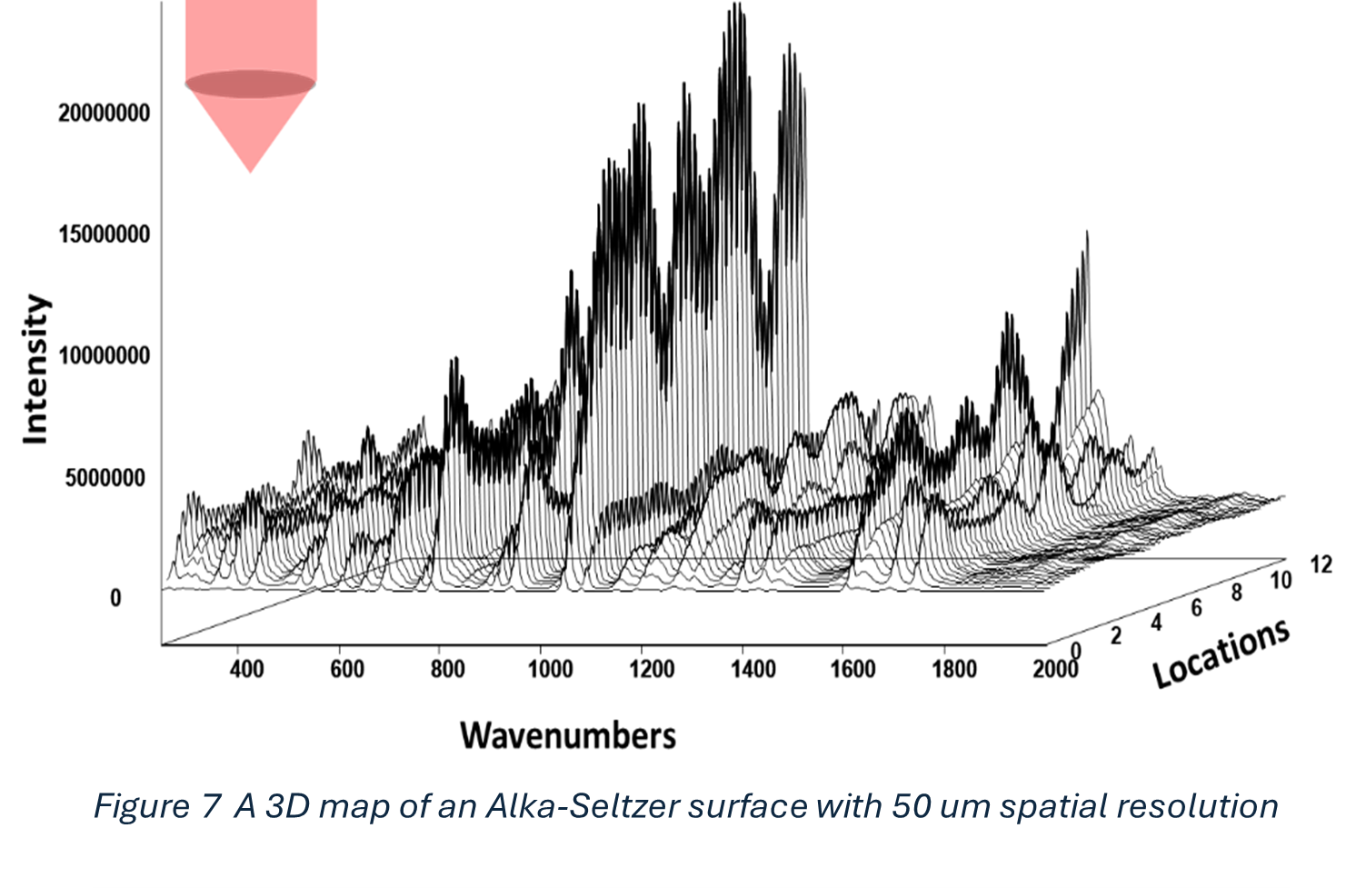 Figure 4 shows spectra collected using a large ~3 mm open-beam configuration while translating across the tablet 13 times. The resulting spectra are highly reproducible, with virtually identical intensities.